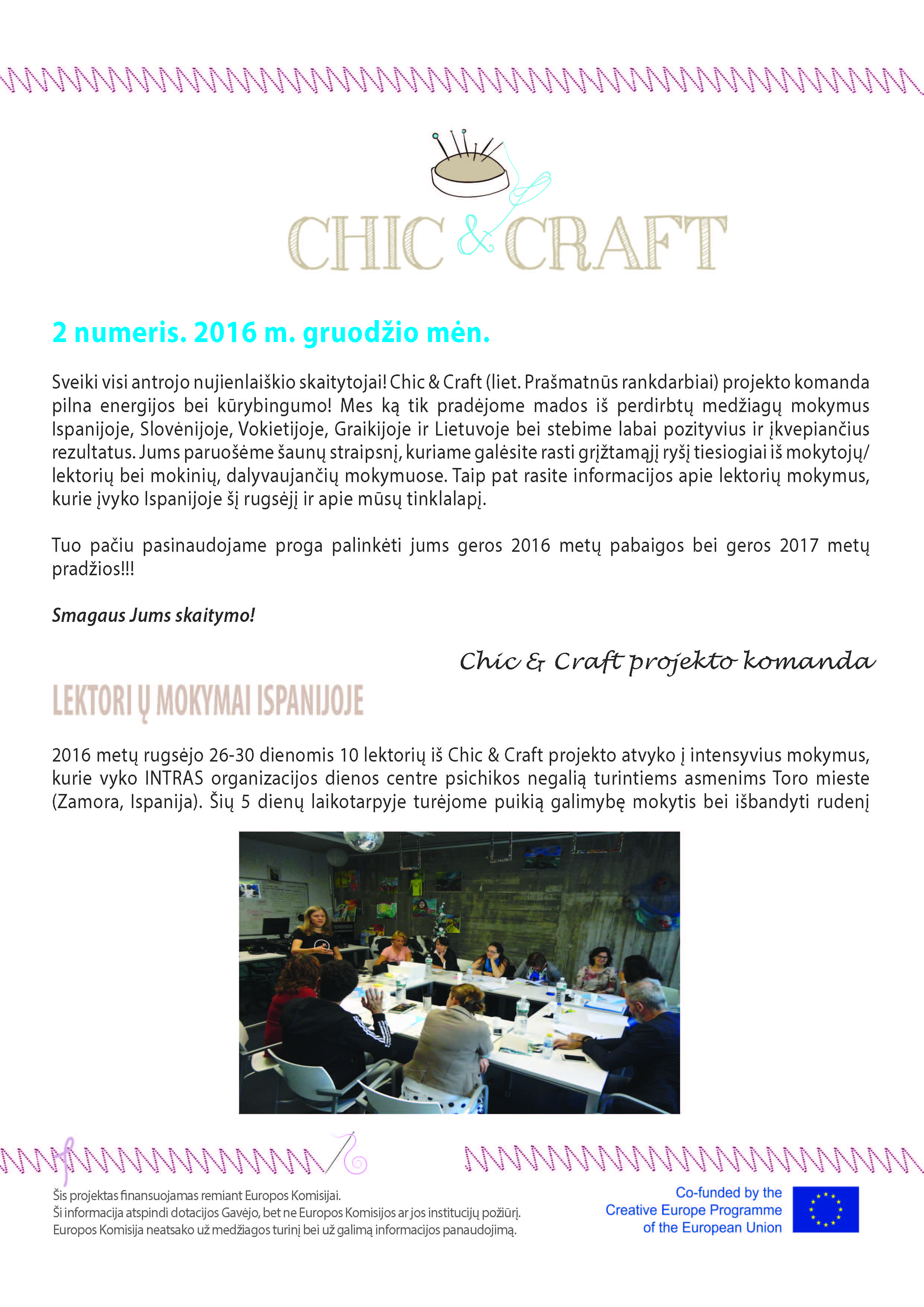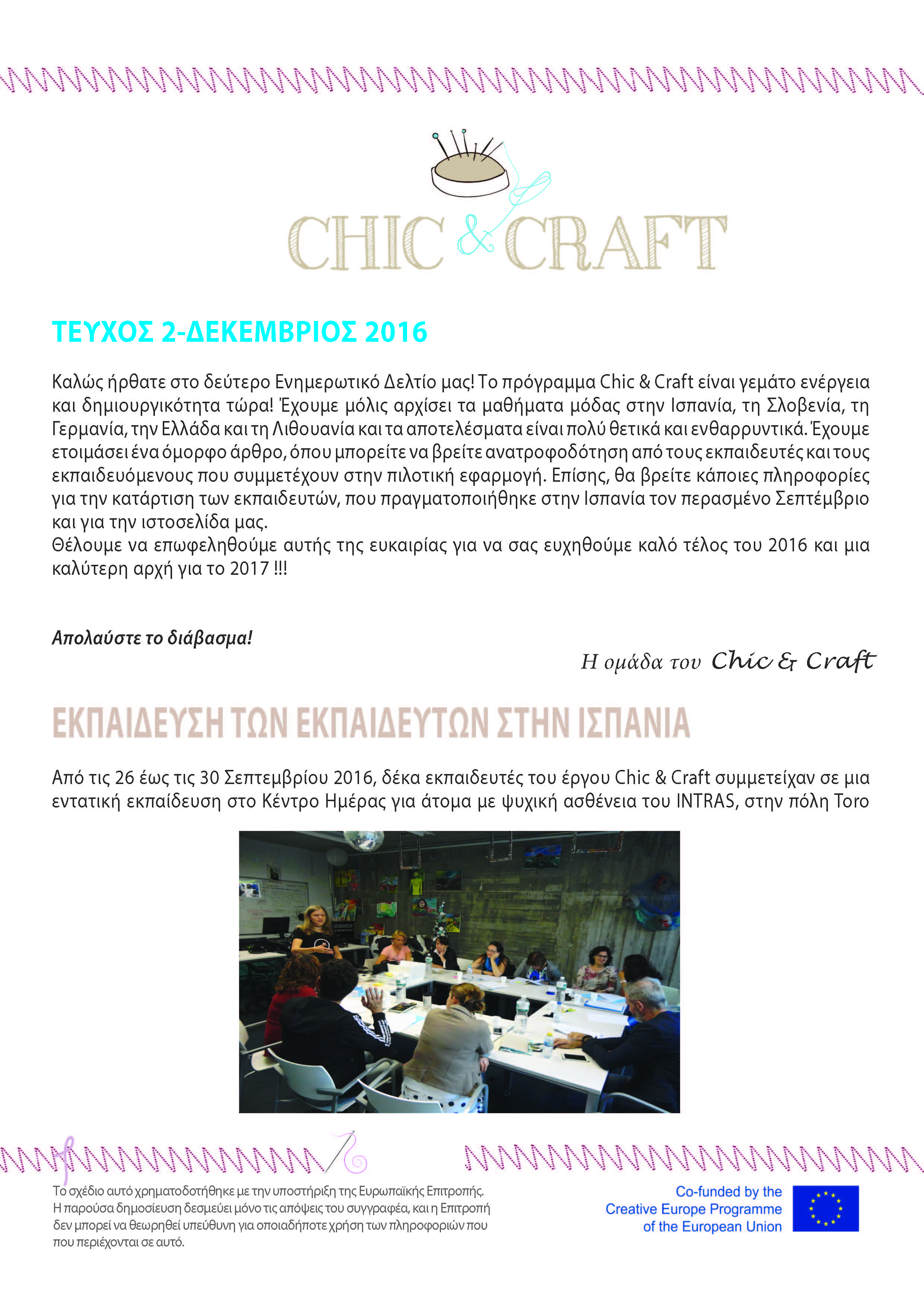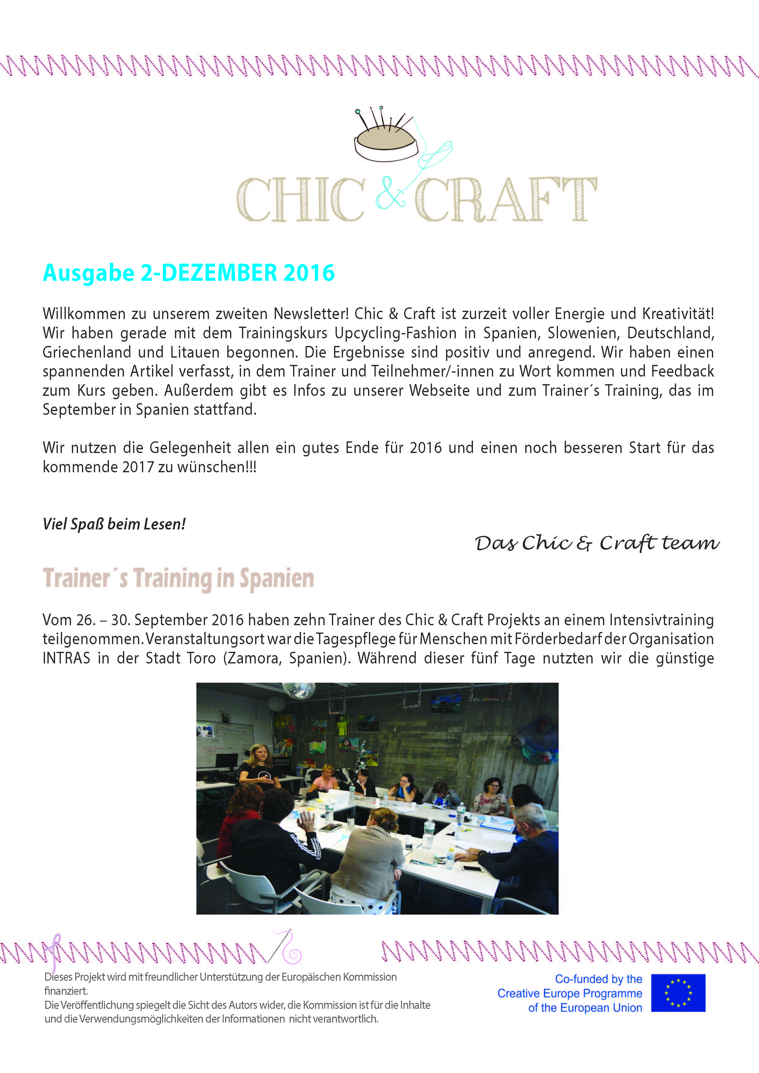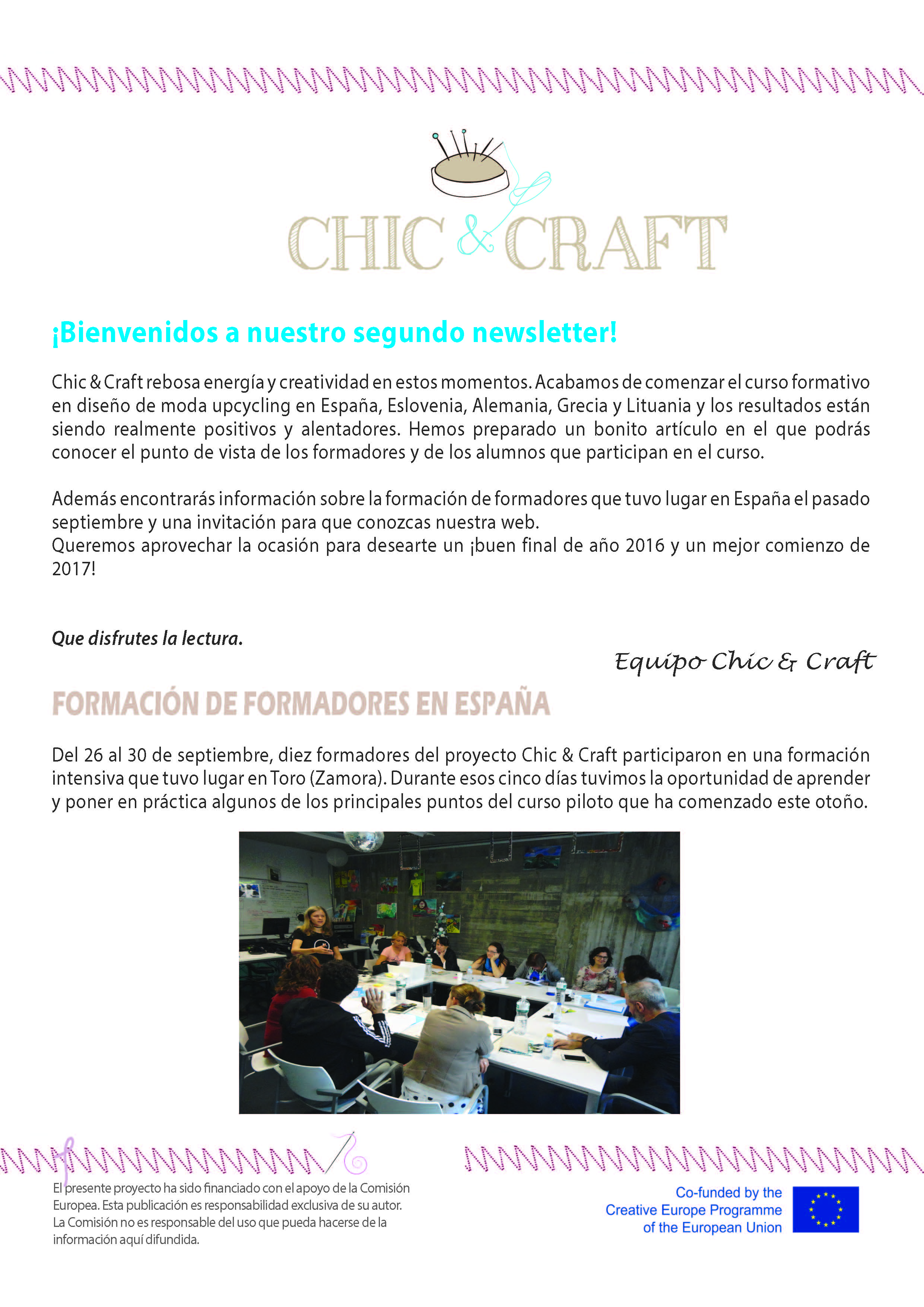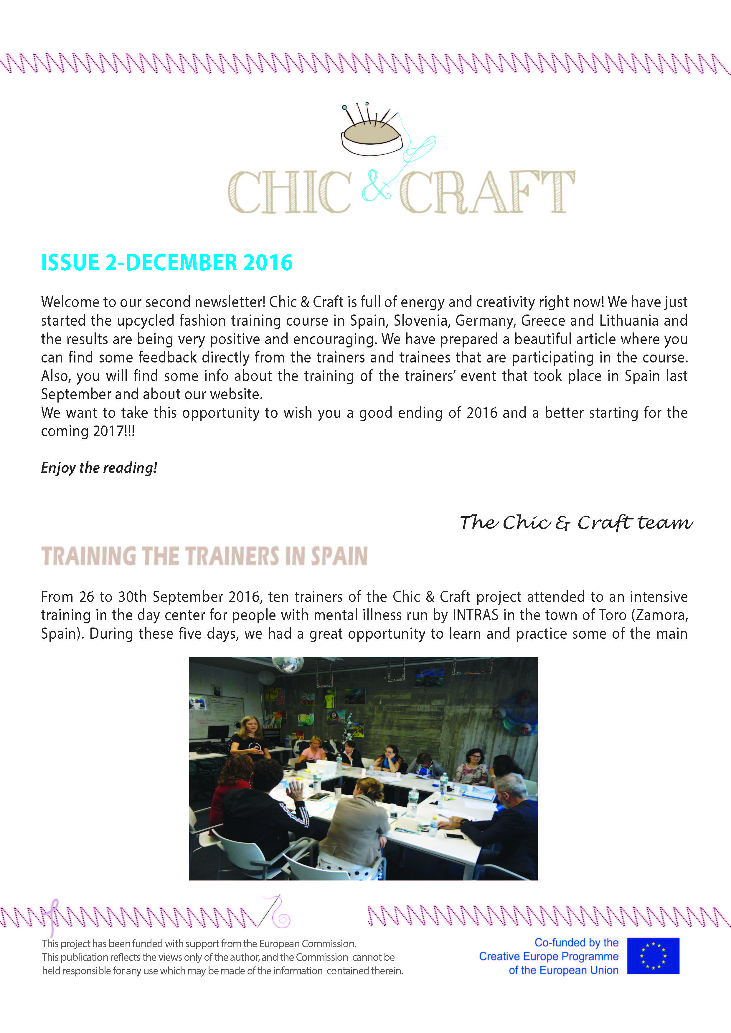 The second issue of the Chic & Craft newsletter has just arrived! Here you can find an article about the training of the trainers that took place in Spain last September and an overview of the Chic & Craft course in the five participating countries. We take this opportunity to wish you a very creative year 2017 full of upcycling ideas and happiness!