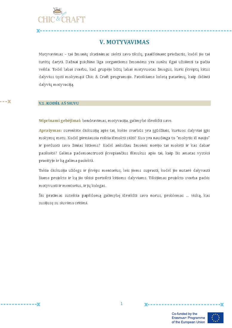 Projekte “Chic & Craft“ buvo suburtos mažos tarpusavio palaikymo grupės (po vieną kiekvienoje dalyvaujančioje šalyje), turinčios patirties dizaino ar siuvimo srityse arba besidomintys mokymo kursu, kad jie galėtų padėti kolegoms įgyvendinant mados mokymo programą. Ši patirtis turėjo teigiamą poveikį dalyviams, kurie jautė, kad turi kažką suteikti savo komandos draugams, jautėsi įgalinti ir naudingi. Likusiems grupės nariams, tarpusavio palaikymo mentorius buvo kontaktinis asmuo, pavyzdys, įkvėpimo ir stiprios motyvacijos veiksnys tęsti mados mokymosi programą.