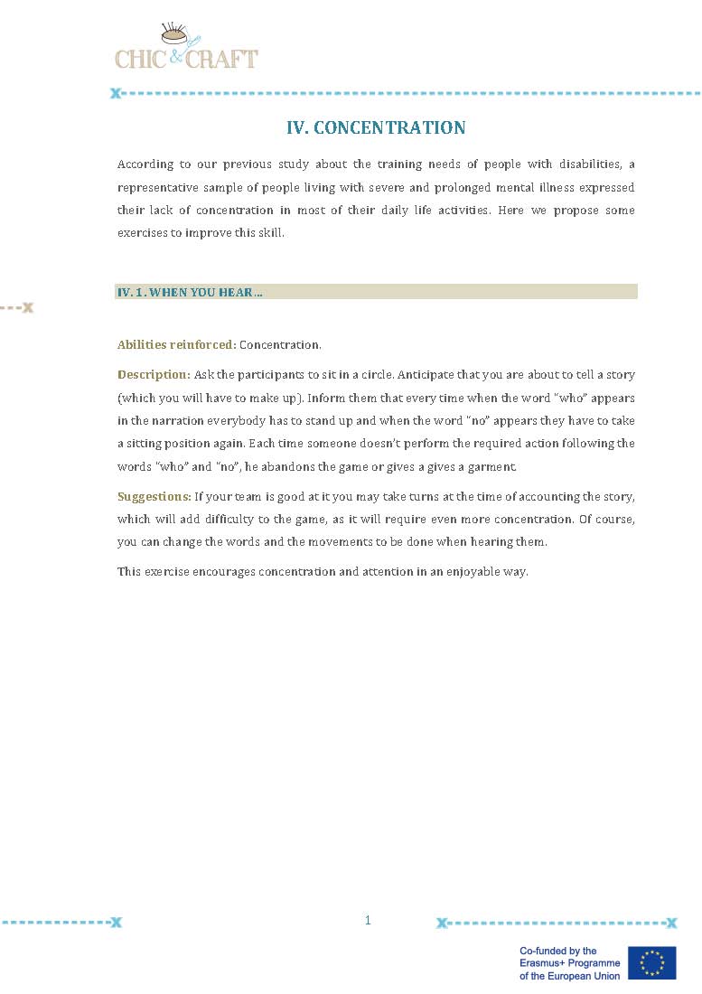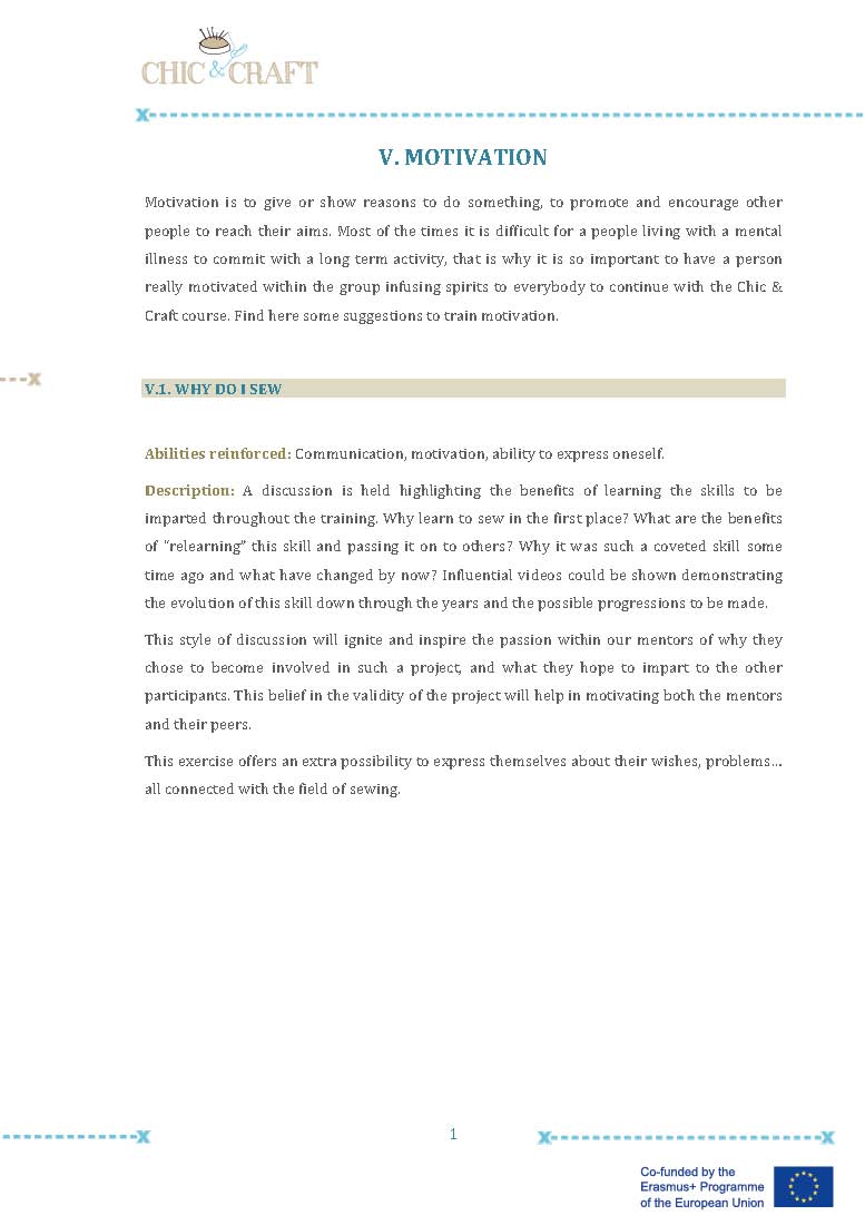 In Chic & Craft we created small groups of peer supporters (one in each pilot experience), with previous experience in designing or sewing or just with an special interest in the training course, so they could help the rest of their mates when implementing the fashion training course. These experiences have been really positive, they felt that they had something to give to their team mates, they felt empowered and valuable. For the rest of the group, the peer supporters were a reference person, a model, an inspiration and a strong motivating factor to continue with the fashion course.