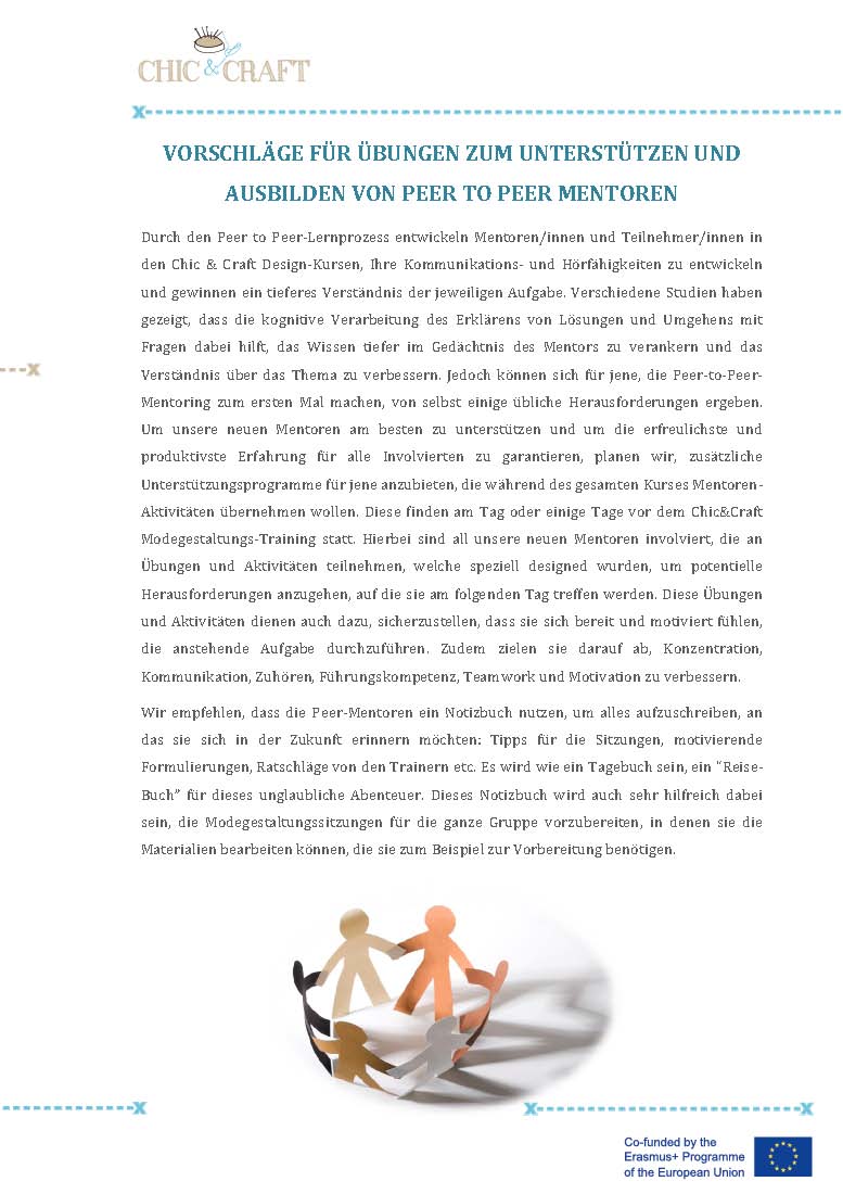 Klicke in die folgenden Sektionen, um mehr über gegenseitige Unterstützung (peer support) und deren Anwendung im Chic & Craft Fashion Trainingskurse zu erfahren.