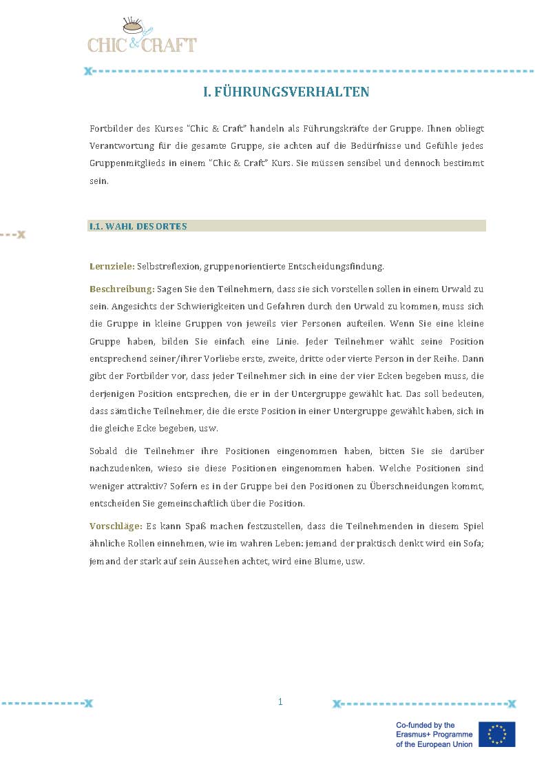 Im Projekt “Chic & Craft” haben wir daher kleine Gruppen mit Unterstützenden (eine Gruppe pro Pilotkurs) gebildet, die Vorkenntnisse in den Bereichen Design oder Nähen hatten oder ein besonderes Interesse an dem Trainingskurs vorwiesen. Die Unterstützer/-innen konnten den anderen bei der Umsetzung des Kurses helfen. Diese Erfahrung war sehr positiv, da sich dadurch das Gefühl entwickelte, dem Team etwas geben zu können und die Personen auf diese Weise Selbstbestätigung und Wertschätzung erfuhren. Sie waren Kontaktperson und Referenz für die anderen Teilnehmer/-innen der Gruppe und verkörperten ein Vorbild, eine Inspiration und ein Motivationsfaktor für den Kurs.